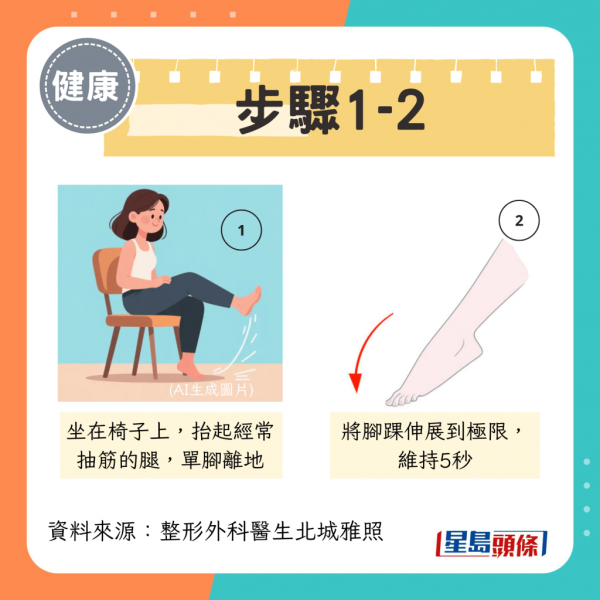 - 坐在椅子上,抬起經常抽筋的腿,單腳離地。