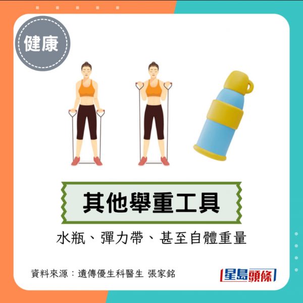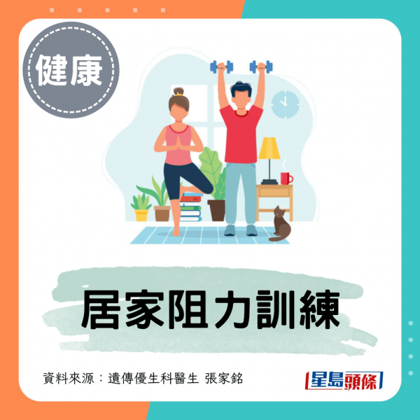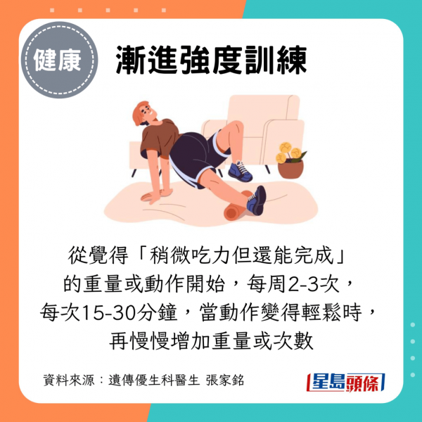 張家銘醫生表示,很多人一聽到「阻力訓練」,可能第一時間都會想起在健身室舉啞鈴和槓鈴,但其實完全可以把訓練融入日常生活。只要有肌肉對抗重量,就是阻力訓練的一部分。例如舉起滿滿的菜籃、抱孫子、搬米袋,甚至是在椅子上重複起身坐下、深蹲、掌上壓等;家裡的水瓶、彈力帶、甚至自體重量,也都是很好的舉重工具。建議從覺得「稍微吃力但還能完成」的重量或動作開始,每周2-3次,每次15-30分鐘,當動作變得輕鬆時,再慢慢增加重量或次數。如此循序漸進的方式,就是漸進強度的訓練,既有更好的降壓與降脂效果,又能降低受傷風險。