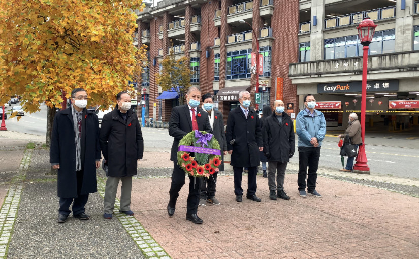 【星島記者張譽報道】周三是加拿大國殤日,受疫情影響,大溫許多地區的悼念儀式一切從簡,並轉至網上進行。溫哥華華華埠華工紀念碑前周三中午12時舉行了簡單獻花儀式,以緬懷為保衛國家而捐軀的華裔軍人,同時紀念華裔先驅遠涉重洋來到加拿大,為加國建設作出貢獻。