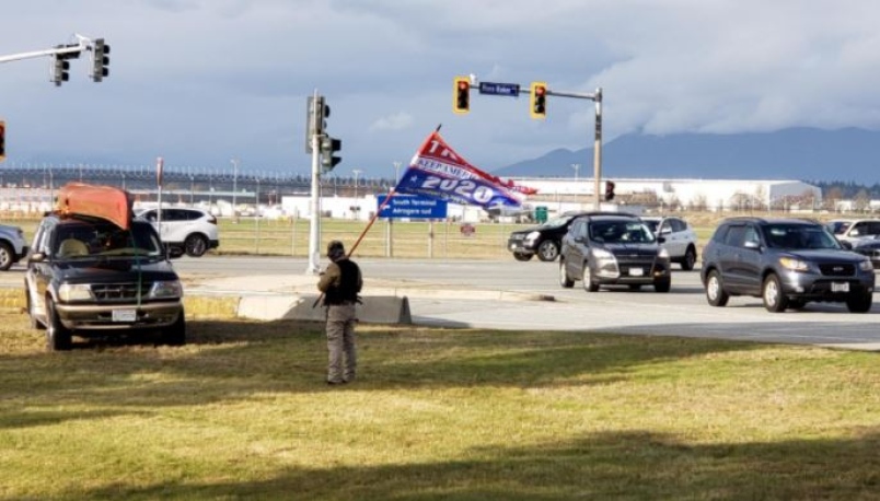 據區報《列治文新聞》(Richmond News)報道,照片中的男子獨自一人行動,他被看見在海島(Sea Island)一處街頭揮舞「特朗普2020」旗幟,吸引來往車輛的司機紛紛注視。