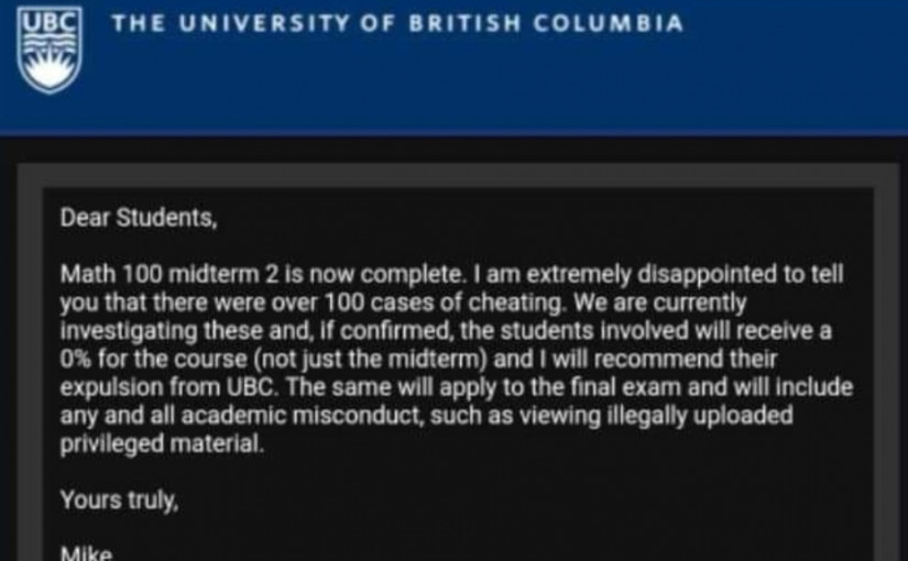 CTV報道,社群網站Reddit上一則關於卑詩大學老師發來的消息,引發了熱議。螢幕截屏上寫著:「我非常失望地告訴大家,有100多個作弊案件。我們正在調查相關情況,如果得到確認,涉案學生的該項課程將得零分(不僅僅是期中考成績),我並建議卑詩大學開除他們。」