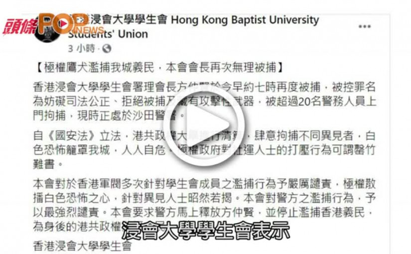 浸大學生會署理會長方仲賢被捕 涉藏攻擊性武器妨礙司法公正