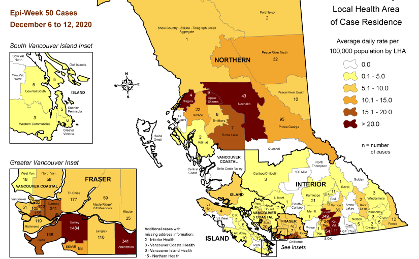 在最新一周,內陸衛生局轄下的南奧卡納根(South Okanagan)和水壺谷(Kettle Valley)地區的,分別錄得54宗及11宗新病例。與之前一周相比,這兩個地區的新病例數目顯著增加。其中水壺谷在12月6日至12日的新病例數目,比11月29日至12月5日所發現的6宗新病例幾乎翻了一番,多了5宗,而南奧卡納根區在本月6日至12日的新病例數目,較11月29日至12月5日所發現的9宗新病例數目更增長了5倍。