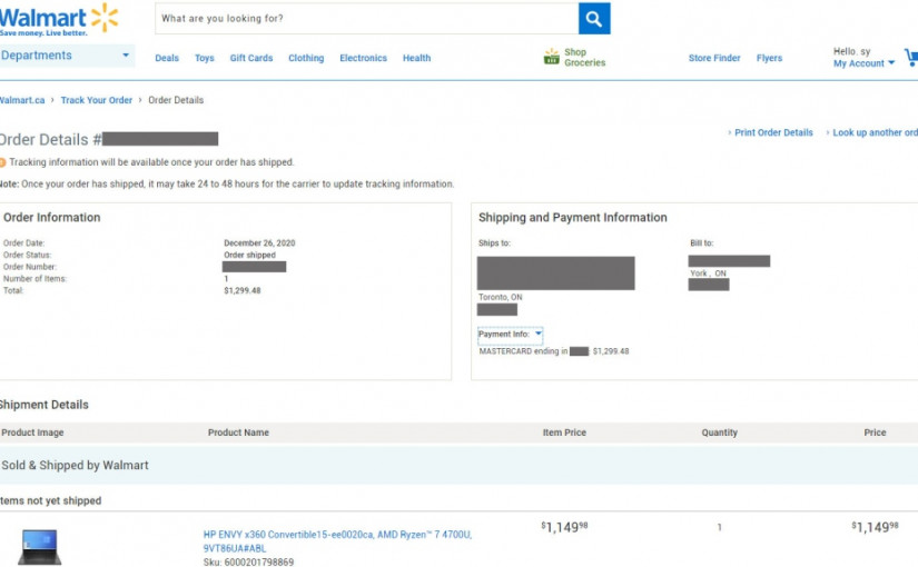 Walmart.ca上顯示的信息包括完整的客戶名稱、帳單郵寄地址,無論產品是送貨到家庭地址還是沃爾瑪在店內取貨。還可以查看訂單是否使用Visa,Mastercard,Amex或PayPal付款。