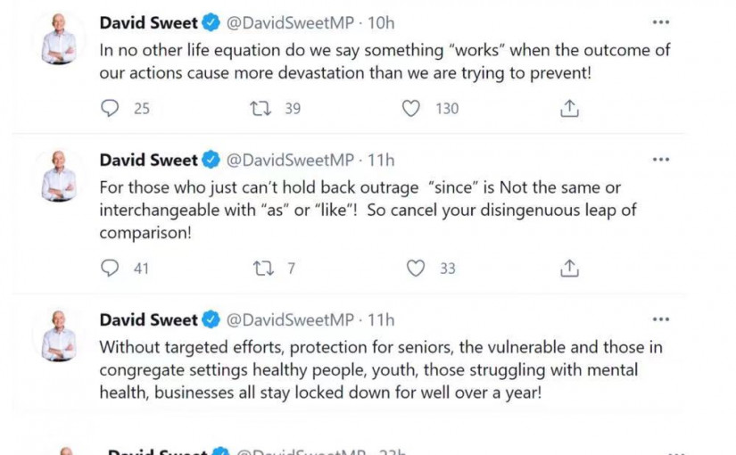 【星島綜合報道】聯邦保守黨國會議員斯威特(David Sweet),周五在推特上發表一段有關批評封鎖措施的言論,斯威特表示,目前實行的封鎖措施是侵犯公民自由權利,更喻其為自二戰拘禁營政策以來最大的侵犯行為。 由於涉及二戰言論,斯威特隨即備受抨擊,並其後為該敏感言論作出道歉。