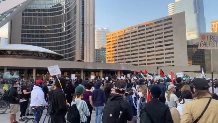 及至傍晚時份,有數以千計人群聚集在Nathan Phillips廣場,支持在以巴衝突中的巴勒斯坦人。與此同時,一小群支持以色列的示威者也聚集在現場附近。警方指,廣場的示威活動約有5千多人參與,警員封鎖了該區部分道路。22歲的Thornhill居民Hamza Alkiswany被控襲擊罪,29歲的多市居民Connor Campbell則被控攜帶武器參加公眾集會。