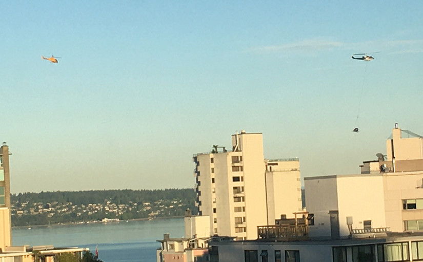 【星島綜合報道】溫市中心西端不少民眾周二清早被直升飛機的噪聲弄醒,更奇怪的在市中心上空盤旋的兩間直升飛機中,一架用繩索吊著一輛深色四驅車飛行,另外一架黃色直升機則跟在後面,不停地轉彎盤旋。