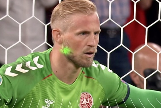 電視畫面顯示,就在卡尼(Harry Kane)在加時賽中主射十二碼罰球前,卡斯柏舒米高臉上出現了綠色光斑。