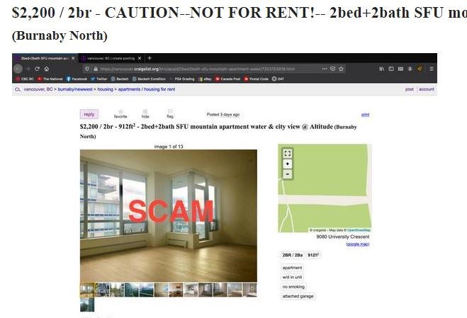 圖片:今年1月大學城的招租騙案廣告。Burnaby Now