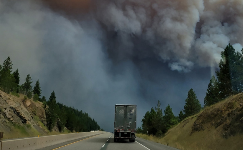DriveBC周二在推特上稱,5號公路上沒有可以使用的設施,駕車者請勿停留,並需留意路上的工作人員及山火和碎片。