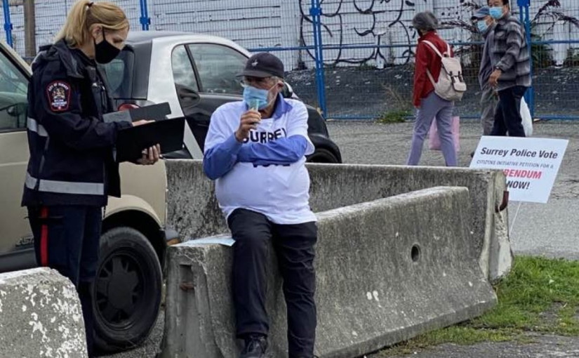 該組織正在支持一項聯署行動,要求省政府就警隊去留問題舉行全民公投。斯科特稱,他上星期日在跳蚤市場收集市民簽名,由於設置了一個告示牌,被市府人員以違反廣告附例為由,開出罰款200元的告票,其他成員也被罰款。