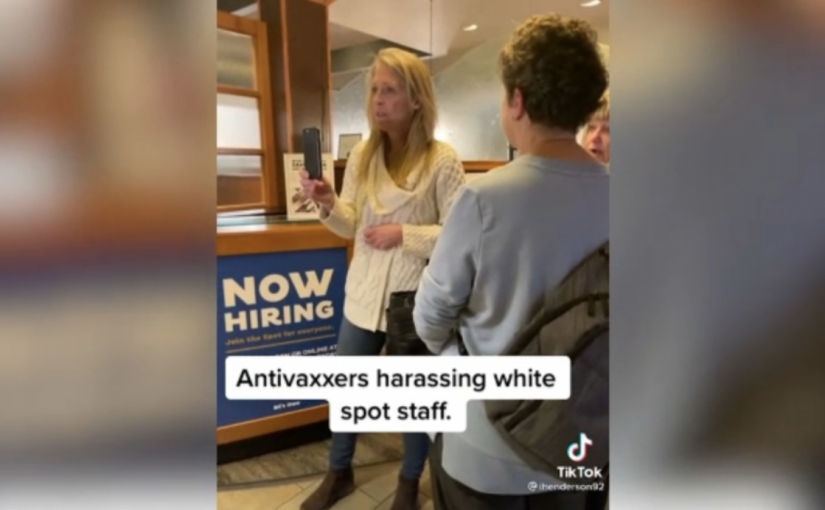 這段未注目日期的視頻在周六晚傳到TikTok上,標題是「反疫苗者騷擾White Spot餐廳員工。」該用戶稱視頻是在高貴林拍攝的。