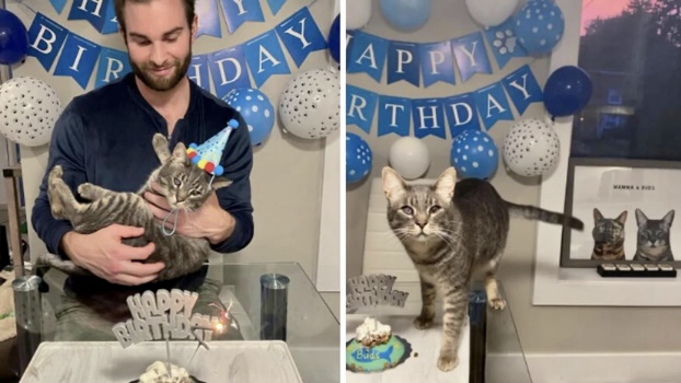 這位聯盟守門員分享了他和伴侶桑尼(Ashley Sonney)爲自家貓咪慶祝生日的一系列照片,照片中有蛋糕和氣球。
