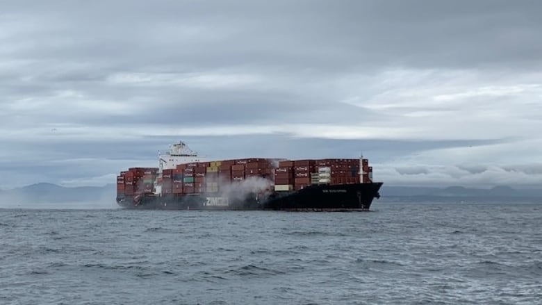 圖片:Zim Kingston貨輪在溫哥華島海面起火。CBC