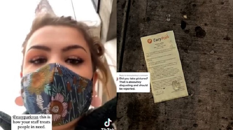 市民古斯羅(Anna Gouthro)在社交平台TikTok上,講述日前在行經煤氣鎮(Gastown)時,看見EasyPark停車場公司兩名職員,將一張紙條貼在一名露宿男子身上,她對此感到非常不滿。「那名露宿者身上蓋著毛氊,而他們竟把告示貼在他的毛氊上。」