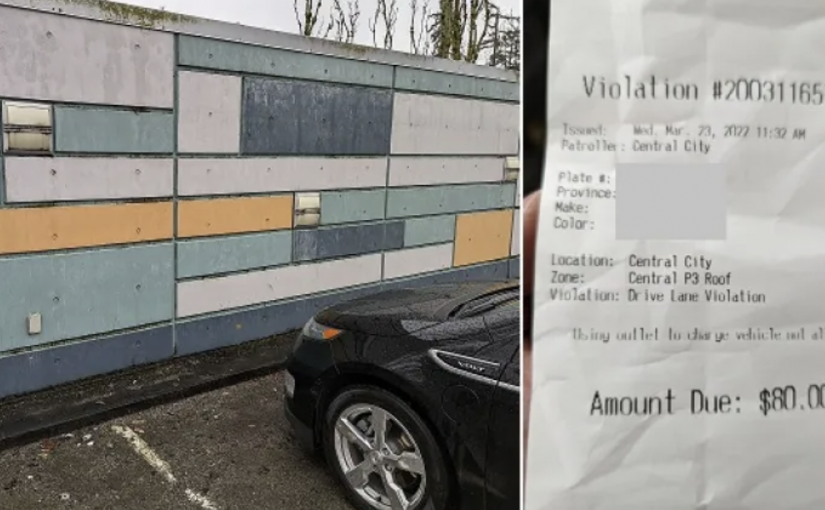 當他一個小時後返回時,看到擋風玻璃上貼著一張80元的罰單,上面寫著:「使用不經允許的插座充電」。