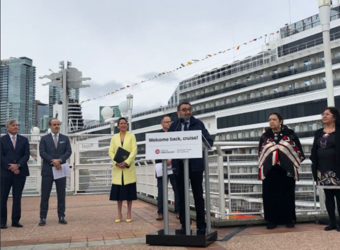 星期日早上,一艘郵輪停靠在溫哥華,為郵輪行業兩年多來首次回歸,預計這些遊客將推動加拿大受疫情重創的旅遊業。