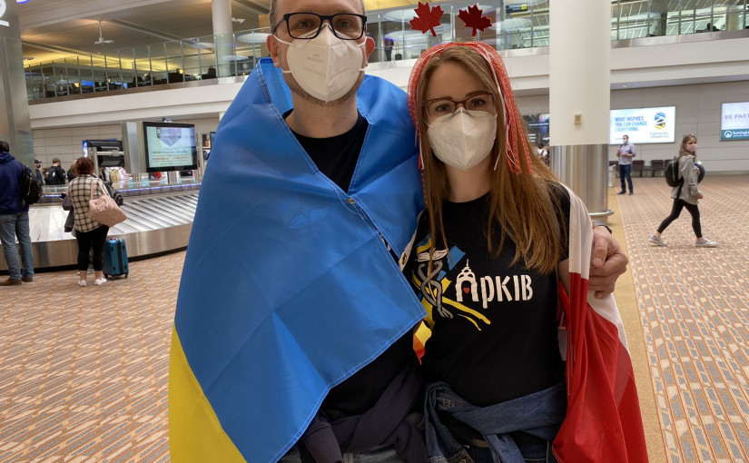 八年前從哈爾科夫(Kharkiv)搬到溫尼辟的帕夫洛(Pavlo)和妻子娜塔莉(Natalie Lebedev)披著烏克蘭國旗在機場等候,原因是帕夫洛的母親和姐姐在飛機上,這對夫婦自從離開後再也沒見過她們。