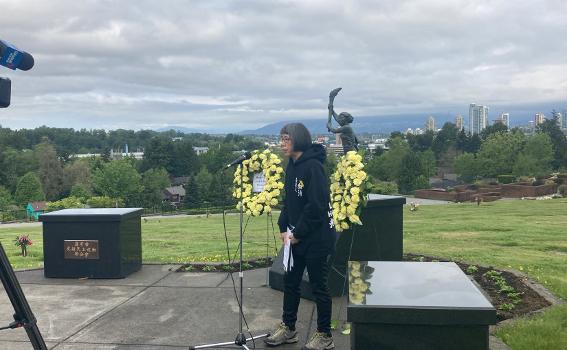 【圖文:星島記者黃良潤】六四周年前夕,溫哥華支持民主運動聯合會周日(29日)於本拿比科士蘭墓園(Forest Lawn Memorial Parlk)及卑詩大學(UBC)先後舉辦兩場悼念活動,向當年犧牲的民運人士獻花。主席李美寶於致辭時,寄語參加者讓歷史「活在眼前,傳至後代」。