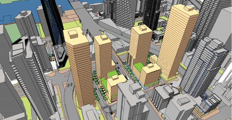 該土地目前由西面的舊黑色車頂的士(Black Top Cabs)辦公室和東面的大陸SRO酒店(Continental SRO hotel)佔用。根據一份城市報告,需要更改土地用途,以允許建造兩幢40層高的市場柏文、兩幢27層的大樓和兩幢12層的混合柏文、出租和社會住房樓宇。