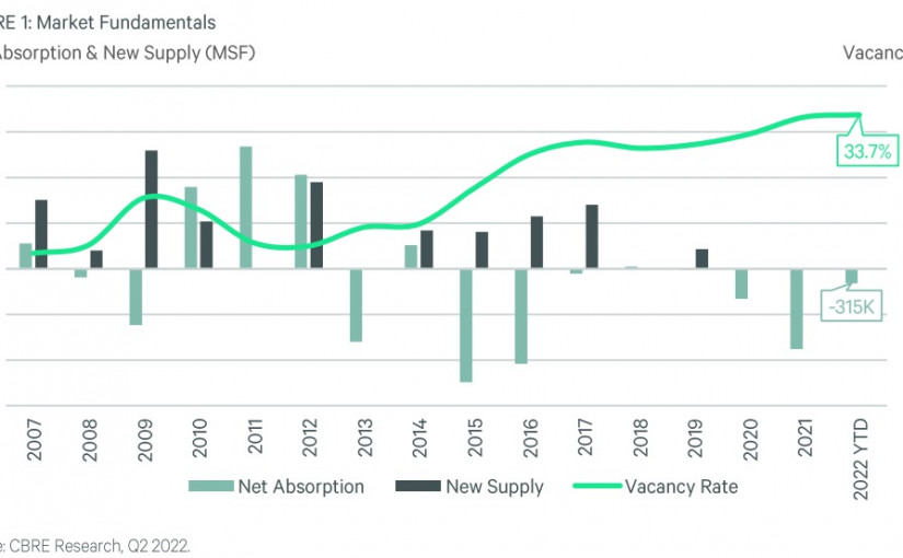 報告稱辦公空間的「能源部門整合」繼續影響市中心的辦公室空置率。