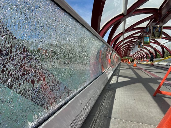 根據第7區市議員黃建磊(Terry Wong),和平橋(Peace Bridge)於周日凌晨有超過80%的玻璃欄杆被人惡意打碎。