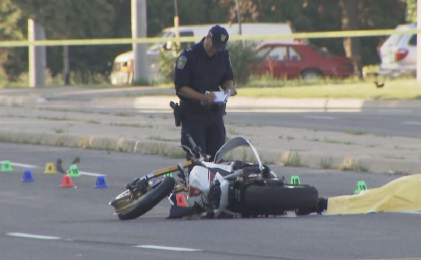 警方說,一輛電單車和一輛豐田小汽車同時在Chinguacousy Road上北向行駛。電單車撞入豐田小汽車的尾部。