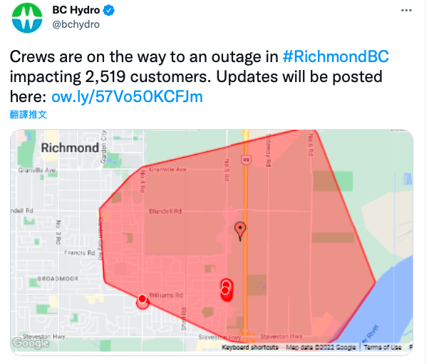 根據卑詩水電公司的停電地圖,停電區域包括列治文花園城路(Garden City Road)以東、橋港路(Bridgeport Road)以南、8號路以西、99號公路以北。