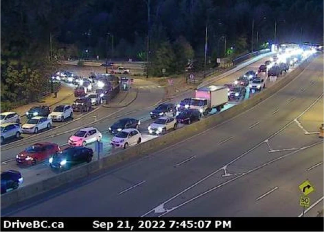 該地區的交通攝像機鏡頭顯示,橋樑兩側的交通擁堵。溫哥華警方建議司機選擇其他路線。