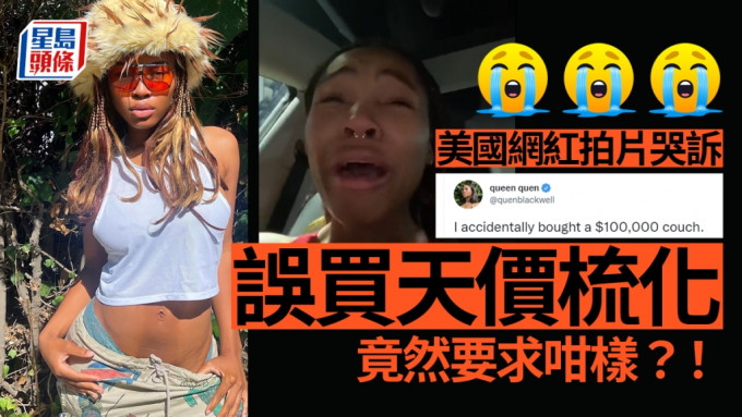 來自德州達拉斯的網紅「queen quen」在Twitter上擁有逾175萬名跟隨者,並經常發布性感照片。她近日上傳一段在車內拍攝的影片,向著鏡頭聲淚俱下,指「我要在路邊停一下,因為我要吐了。」她指,自己早前「不小心」網購了一張價值10萬美金的沙發,並指最初只是「開玩笑」將沙發加入購物車,再假裝刷卡並填妥信用卡資訊,沒想到卻意外按到交易成功。她哭著說,「我只是在開玩笑」,並向網民表示「如果你有100萬美金,可以拜託你抖內(捐款)給我一點嗎?拜託,拜託。」