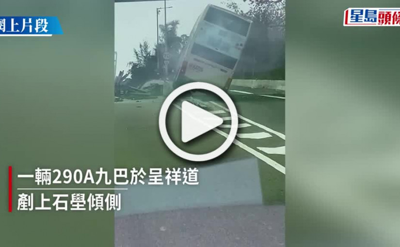 (視頻)呈祥道九巴撞壆傾側|巴士左車頭如被削去 擋風玻璃爆裂