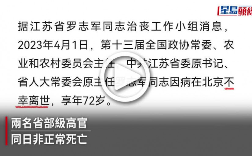 (視頻)消息:前江蘇書記羅志軍自殺 兩高官同日輕生