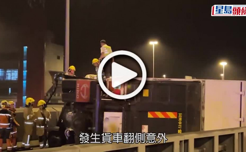 (視頻)青衣貨車猛撼防撞欄翻側 滑行50米冒煙漏油 司機疑「瞌眼瞓」釀禍受傷
