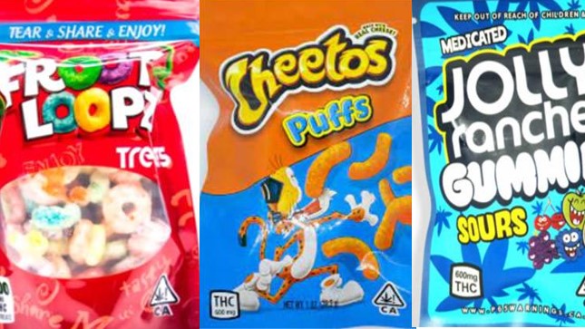 衛生部在網址發布圖片,列出多種仿似暢銷品牌Starburst、 Doritos、 Oreos包裝的大麻食品。