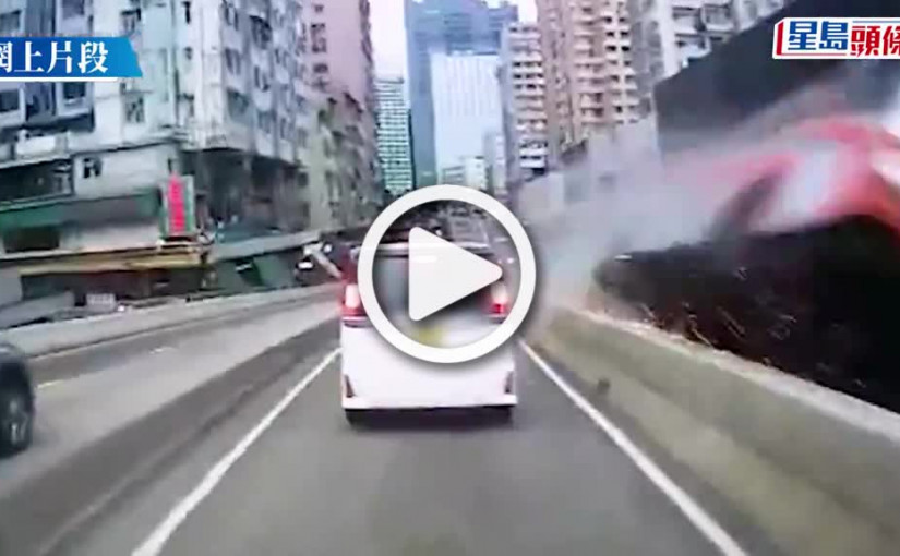 (視頻)荃灣旅巴翻側|事發一刻車Cam曝光 剷上石壆飛起火花四濺