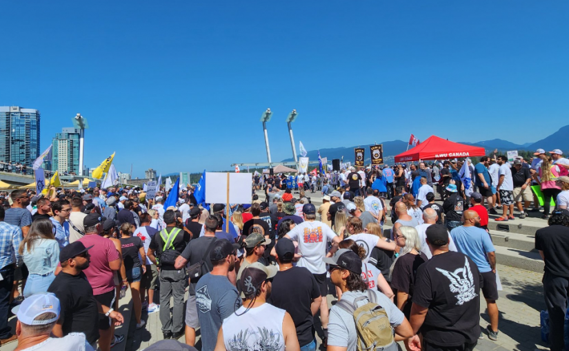 Huge turnout in support of longshore workers on strike in Metro Vancouver today. Unifor members including port container truck drivers were out to stand in solidarity for a fair contract. One day longer, one day stronger! #bclab #canlab #vanpoli pic.twitter.com/Ya2dxs1Ea3