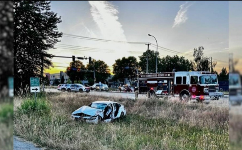 與此同時,還可以看到一輛嚴重受損的銀色私家車落在道路另一邊的草地上。現場還發現了包括列治文皇家騎警警車、救護車和消防車在內的緊急車輛。
