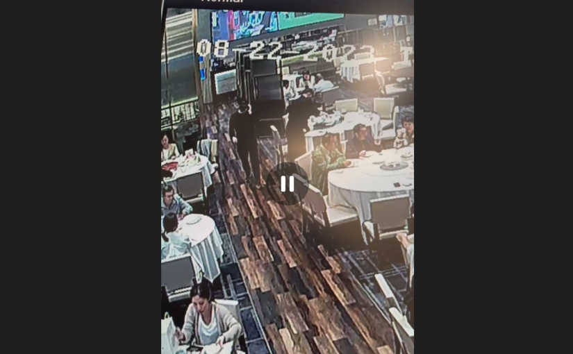 影片顯示,一名全身黑衣男子、戴著帽子在8月22日晚間8點45分走進餐廳,他裝作正在打電話的模樣,但很快地轉身搶走了身旁一個正在用餐的女士的手袋,然後迅速逃離現場,整個事發過程僅僅幾秒時間。
