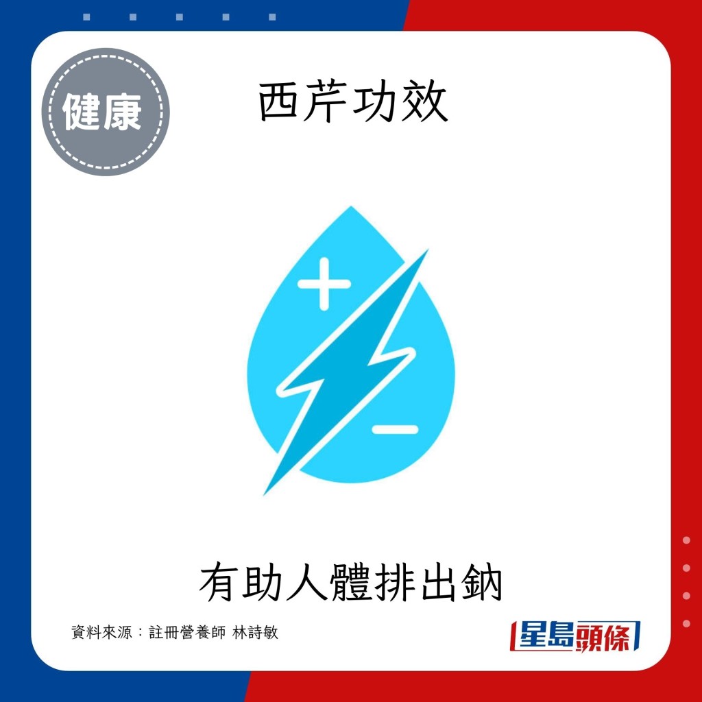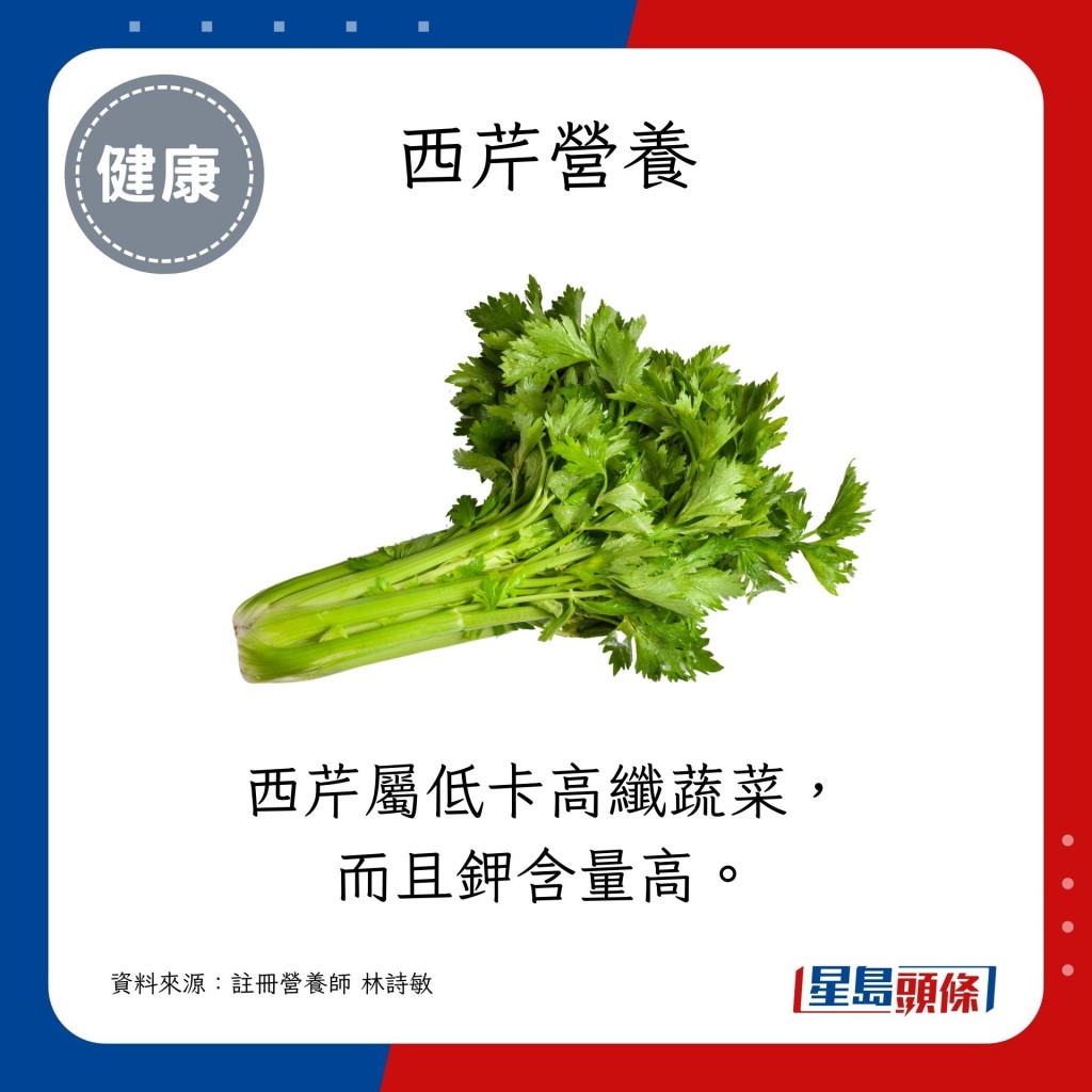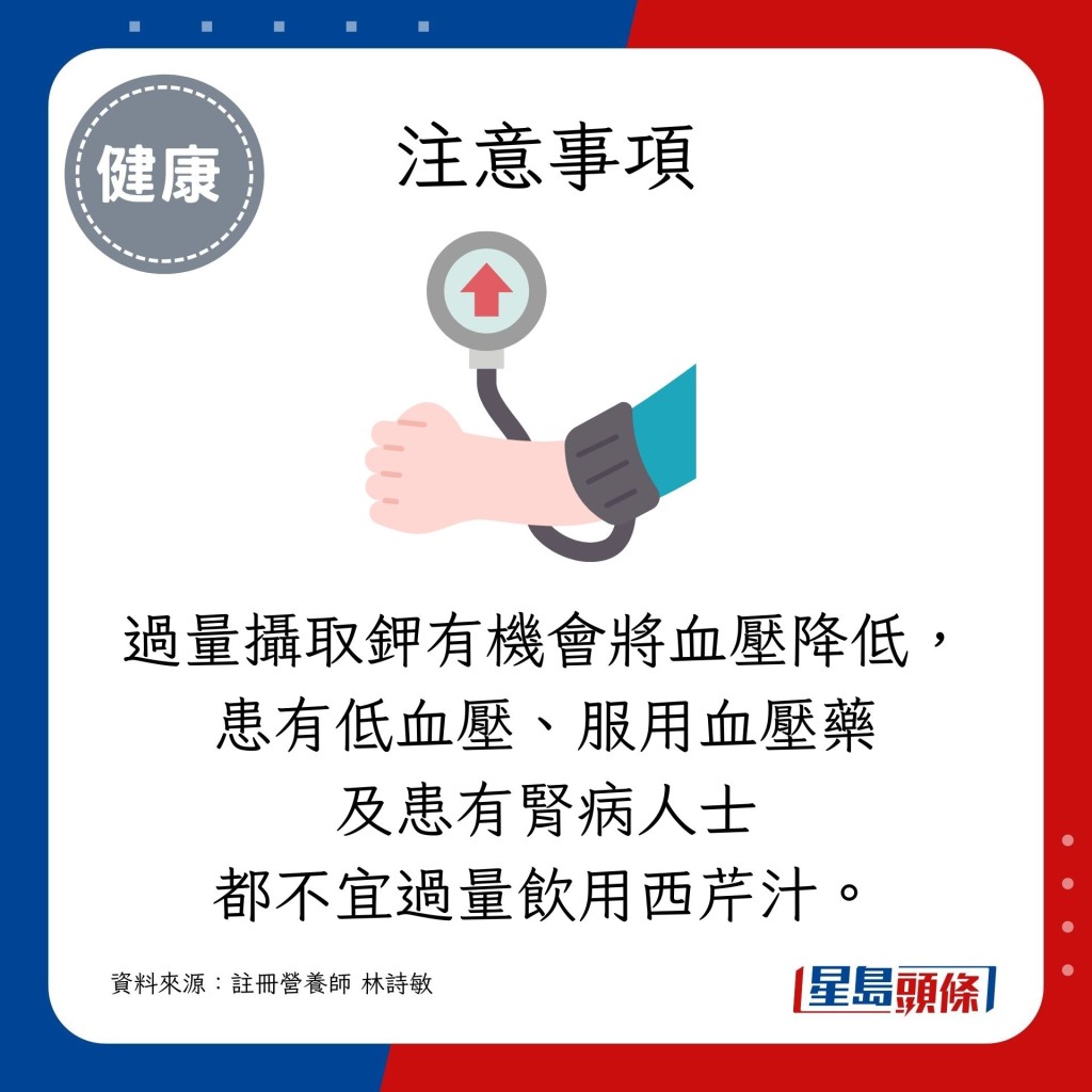 - 食用宜忌:鉀能溶於水中,有人會飲用西芹汁來去水,但製作蔬菜汁需要大量西芹,因此蔬菜汁的鉀含量非常高。過量攝取鉀亦有機會令血壓大為降低。低血壓、服用血壓藥及腎病人士都不宜過量飲用。