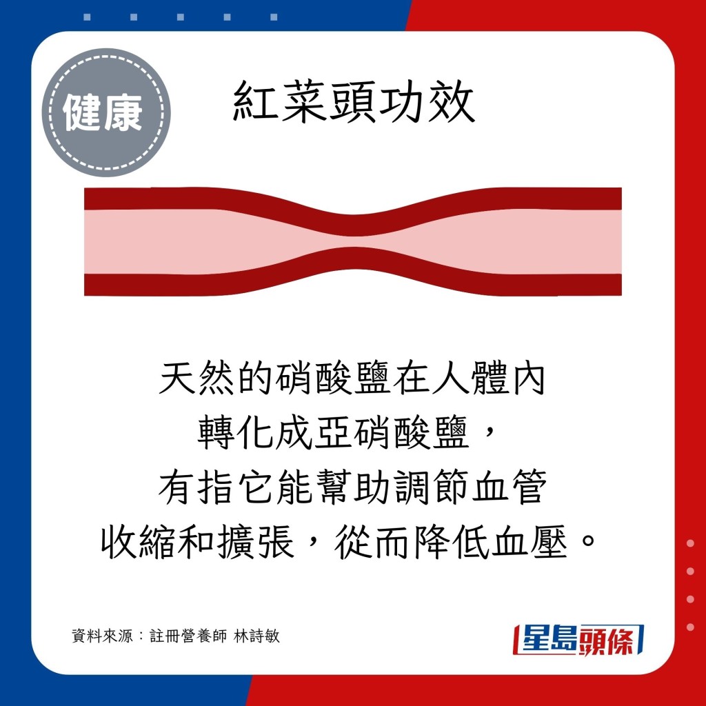 - 功效:含有天然的硝酸鹽,在人體內轉化成亞硝酸鹽。有指能幫助調節血管收縮和擴張,從而降低血壓。