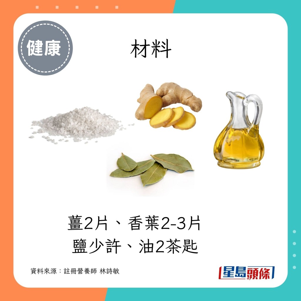 - 番茄2個、薯仔2個、西芹半棵、紅蘿蔔4條、牛腱4両(160g)、薑2片、香葉2至3片、鹽少許、油2茶匙
