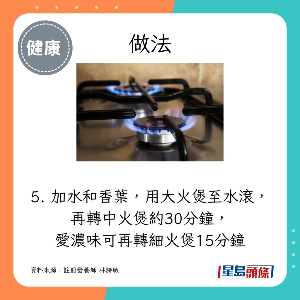 - 加水和香葉,大火煲至水滾,再轉中火煲約30分鐘,喜愛濃味者可轉細火多煲15分鐘。