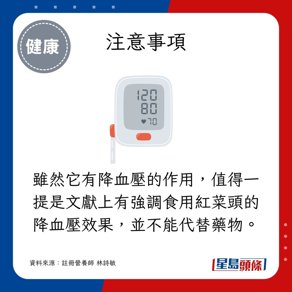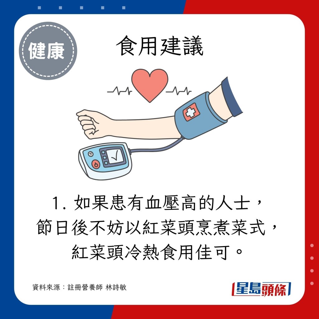 - 食用建議:血壓高人士,節日過後不妨以此烹煮菜式。紅菜頭冷熱食用皆可。煮雜菜湯加入紅菜頭顏色鮮艷又增添甜味。