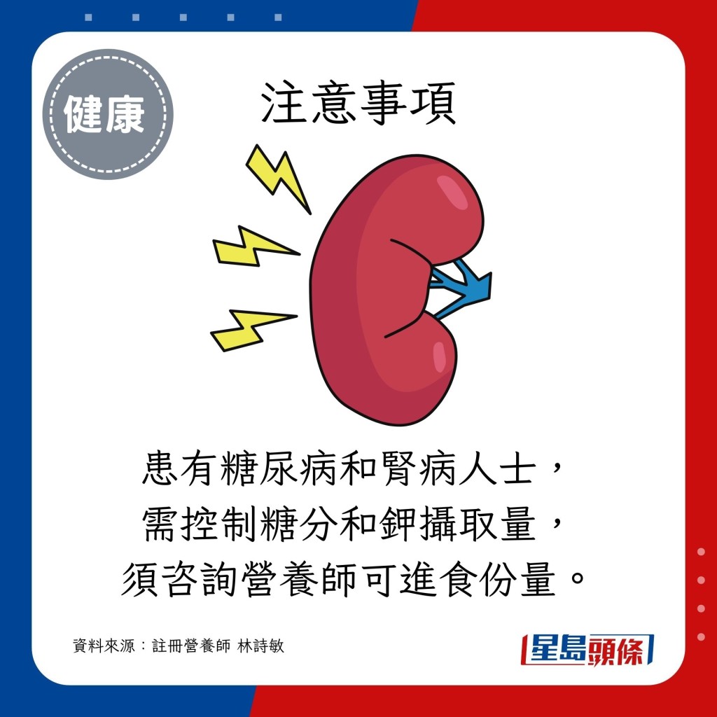 - 食用宜忌:糖尿病和腎病人士,須控制糖分和鉀攝取量,應先諮詢營養師才食用。