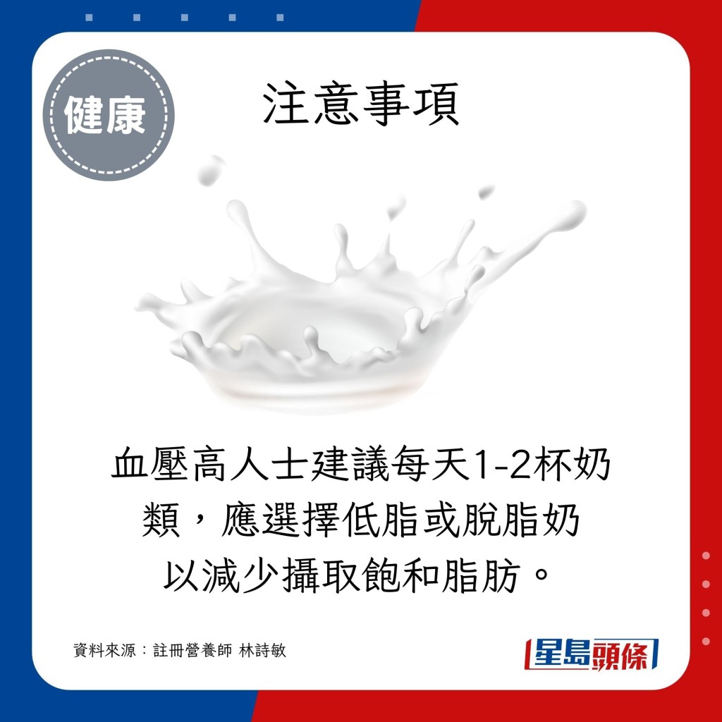 - 食用建議:血壓高人士,建議每天喝1至2杯,選擇低脂或脫脂奶以減少攝取飽和脂肪。