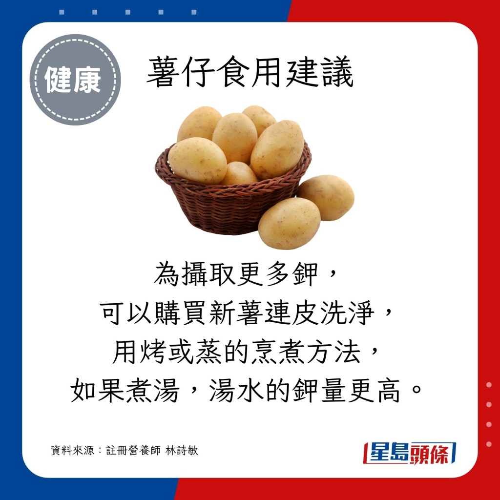 - 食用建議:為攝取更多鉀,可購買新薯連皮洗淨,用烤或蒸的烹煮方法。如果煮湯,湯水中的鉀含量會更高。