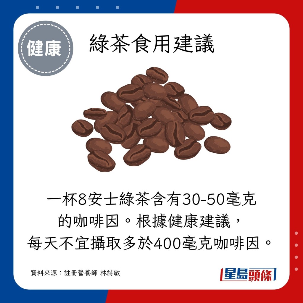 - 食用宜忌:1杯8oz綠茶含有30至50mg咖啡因。根據健康建議,每天不宜攝取多於400mg的咖啡因。因此,在每天8杯水當中可包括綠茶,但不應為了去水腫而全日只喝綠茶。