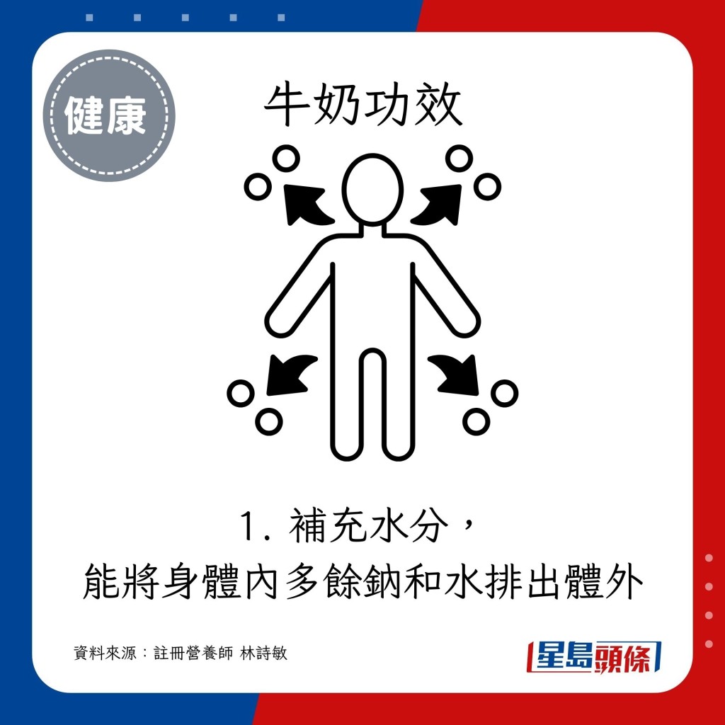 - 牛奶超過80%是水分,將多餘鈉和水排出體外的其中一環,就是多補充水分。