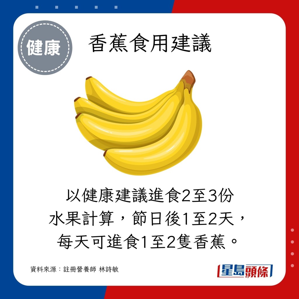 - 食用建議:以一般健康建議進食2至3份水果來計算,節日後1至2天,每天可進食1至2隻香蕉。
