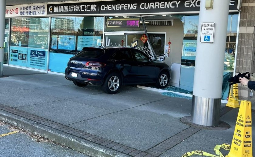 【星島綜合報道】一輛房車星期日衝進了列治文八佰伴中心一家商店,店舖櫥窗損毀,稍後被木板臨時圍封。